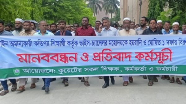 কুয়েট ভিসির পক্ষে শিক্ষক-কর্মকর্তাদের সমাবেশ, হলের ইন্টারনেট সংযোগ বিচ্ছিন্ন