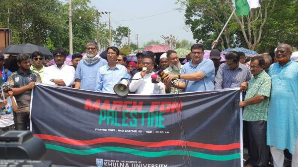 গাজায় ইসরায়েলি গ/ণ/হ/ত্যা/র প্রতিবাদে – খুবিতে সমাবেশ
