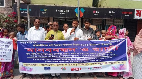 পরেশ দেবনাথ, কেশবপুর, যশোর|| কেশবপুরে পরিত্রানে উদ্যোগে গণজমায়েত ও মানববন্ধন অনুষ্ঠিত হয়েছে। “বর্ণবাদ নিপাত যাক, মানবতা মুক্তি পাক’ এই প্রতিপাদ্যকে