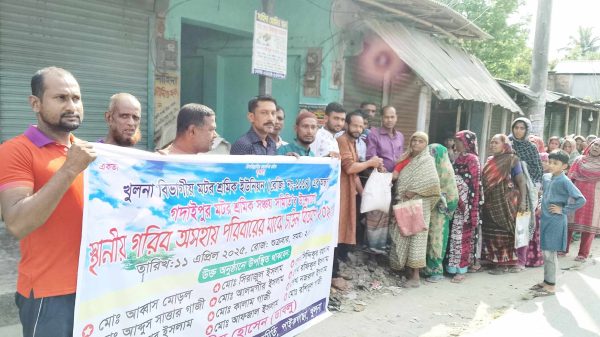 পাইকগাছার গদাইপুর মটর শ্রমিকদের উদ্যোগে দরিদ্রদের মাঝে চাউল বিতরণ