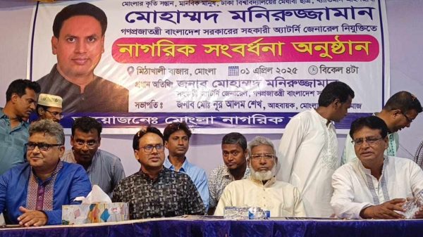 অতনু চৌধুরী(রাজু)বাগেরহাট প্রতিনিধি||বাগেরহাটের মোংলায় নবনিযুক্ত সহকারি অ্যাটর্ণি জেনারেল মোহাম্মদ মনিরুজ্জামানকে নাগরিক সংবর্ধনা। মঙ্গলবার (০১ এপ্রিল) বিকেলে মোংলার মিঠাখালী বাজারে মোংলা