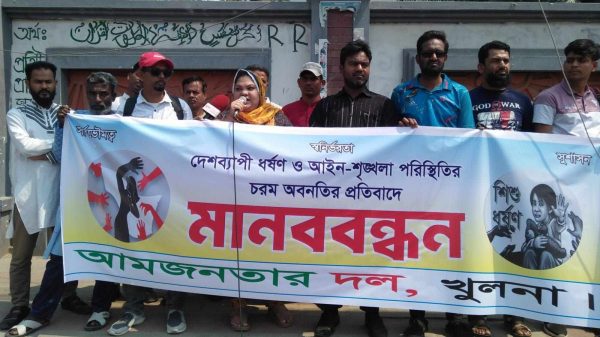 ধর্ষকের বিচারের দাবি ও আইনশৃঙ্খলা পরিস্থিতির অবনতির প্রতিবাদে আমজনতার দল খুলনা,র মানববন্ধন অনুষ্ঠিত
