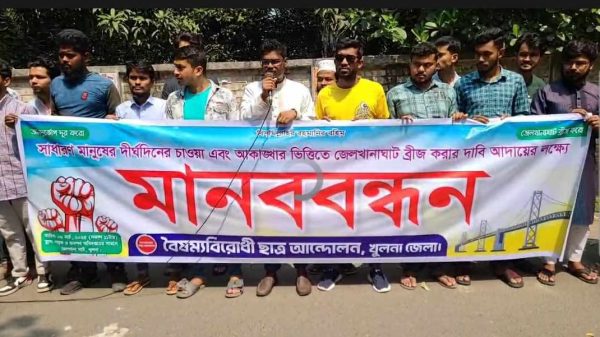 খুলনা জেলখানা ঘাটে ব্রিজ নির্মাণের দাবিতে বৈষম্য বিরোধী ছাত্র আন্দোলনের মানববন্ধন